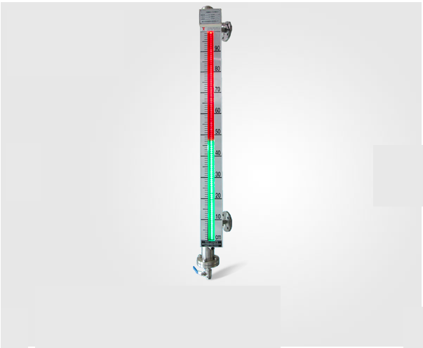 非磁性傳感器管通過(guò)上下法蘭與液體容器連通,在傳感器管內(nèi)裝有一個(gè)磁性浮子,浮子根據(jù)介質(zhì)的比重設(shè)計(jì),浮子內(nèi)磁鋼與容器內(nèi)液面等高,液位顯示盒內(nèi)感磁部件和LED雙色發(fā)光管上下有序排列,與磁場(chǎng)相對(duì)應(yīng)的感磁部件受磁后,觸發(fā)相應(yīng)的電路,無(wú)液全紅,滿液全綠;紅色顯示汽相,綠色顯示液相,紅綠交界處就是容器內(nèi)的實(shí)際液位,液綠汽紅,一目了然。